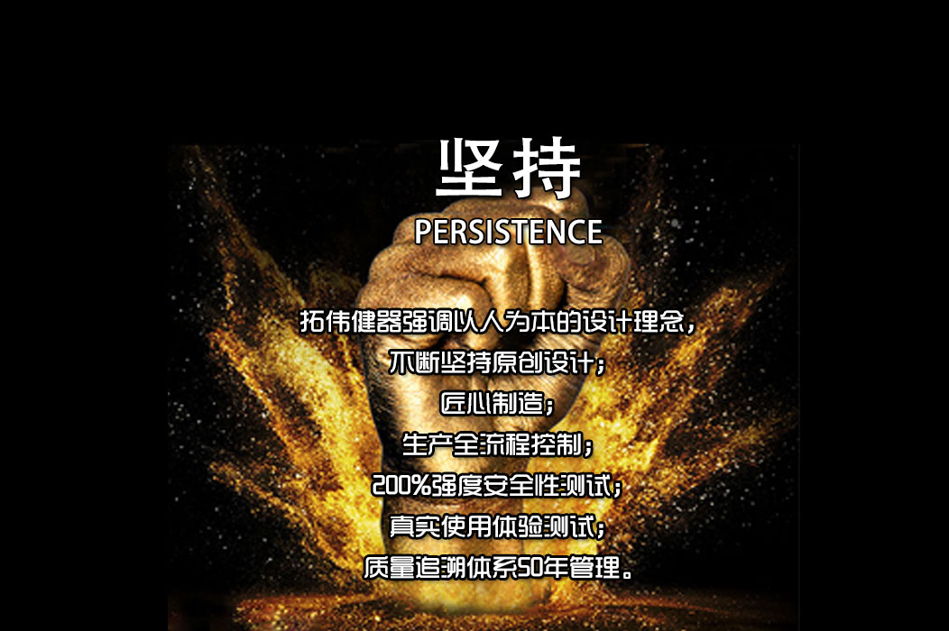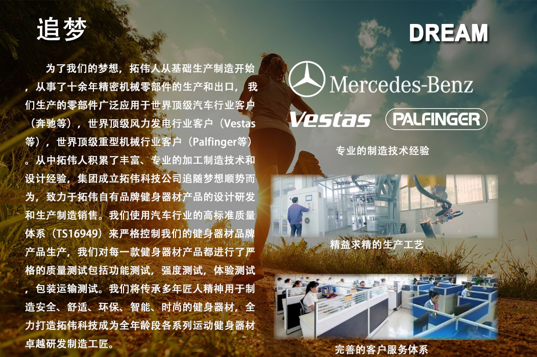 追梦:传承多年匠人精神用于制造安全、舒适、环保、智能、时尚的健身器材,使拓伟科技成为全系列运动健身器材制造工匠。